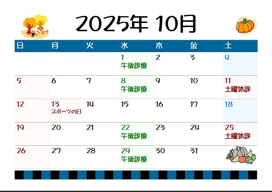 お知らせ, 診療予定 2025年10月の診療予定です ebata 2025年10月1日 Tweet 13日はスポーツの日、11日25日は土曜休診日で休診です。1日8日22日29日は午後から診療になります。ご迷惑をお掛けしますがご了承下さい。 ← 2025年9月の診療予定です