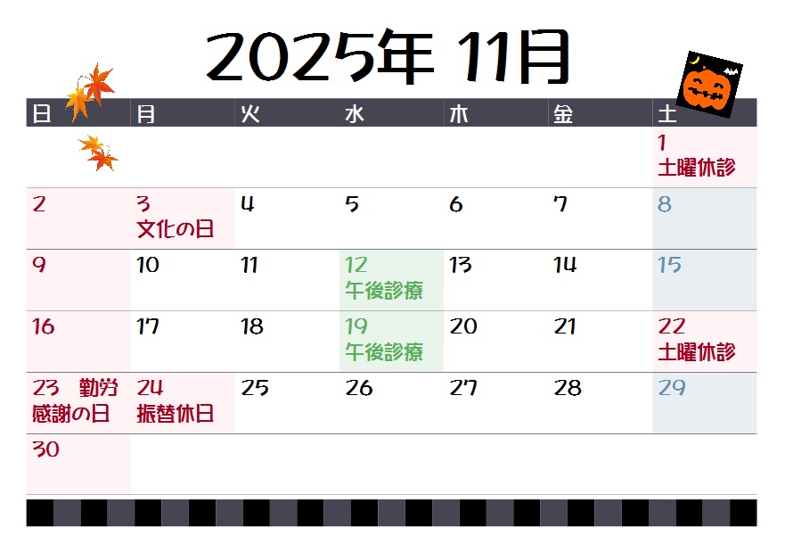 未分類 2025年11月の診療予定 ebata 2025年10月29日 Tweet 3日は文化の日、24日は勤労感謝の日の振替休日です。土曜休診日は1日22日、12日19日は午前休診午後から診療です。ご迷惑をお掛けしますがご了承下さい。 ← 2025年10月の診療予定です