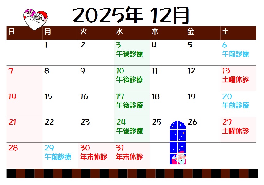 お知らせ, 診療予定 2025年12月の診療予定です ebata 2025年11月19日 Tweet 29日午前中で今年の診療は終わりになります。30日31日年末休診、13日27日を土曜休診としてお休みします。3日10日17日24日は午前休診午後から診療となります。御迷惑をお掛けしますがご了承下さい。 ← 2025年11月の診療予定